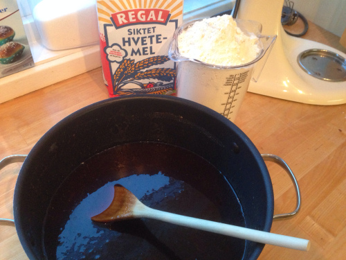 - Margarin, sirup, sukker og krydder varmes i en kjele.