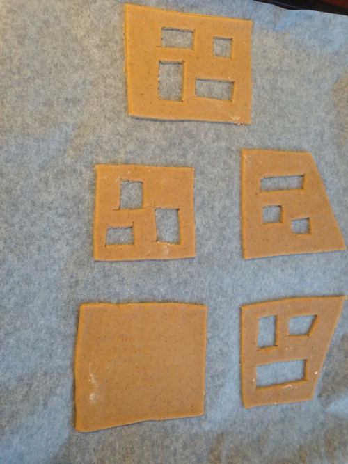 - Kjevle ut deigen (ikke for tynn), og skjær ut vegger og tak, Evt stikk ut figurer. Tips til utbaking; fibramel er supert å bruke til utbaking. Da blir det ikke melete, og deigen blir likevel lett å få av bakebenken.