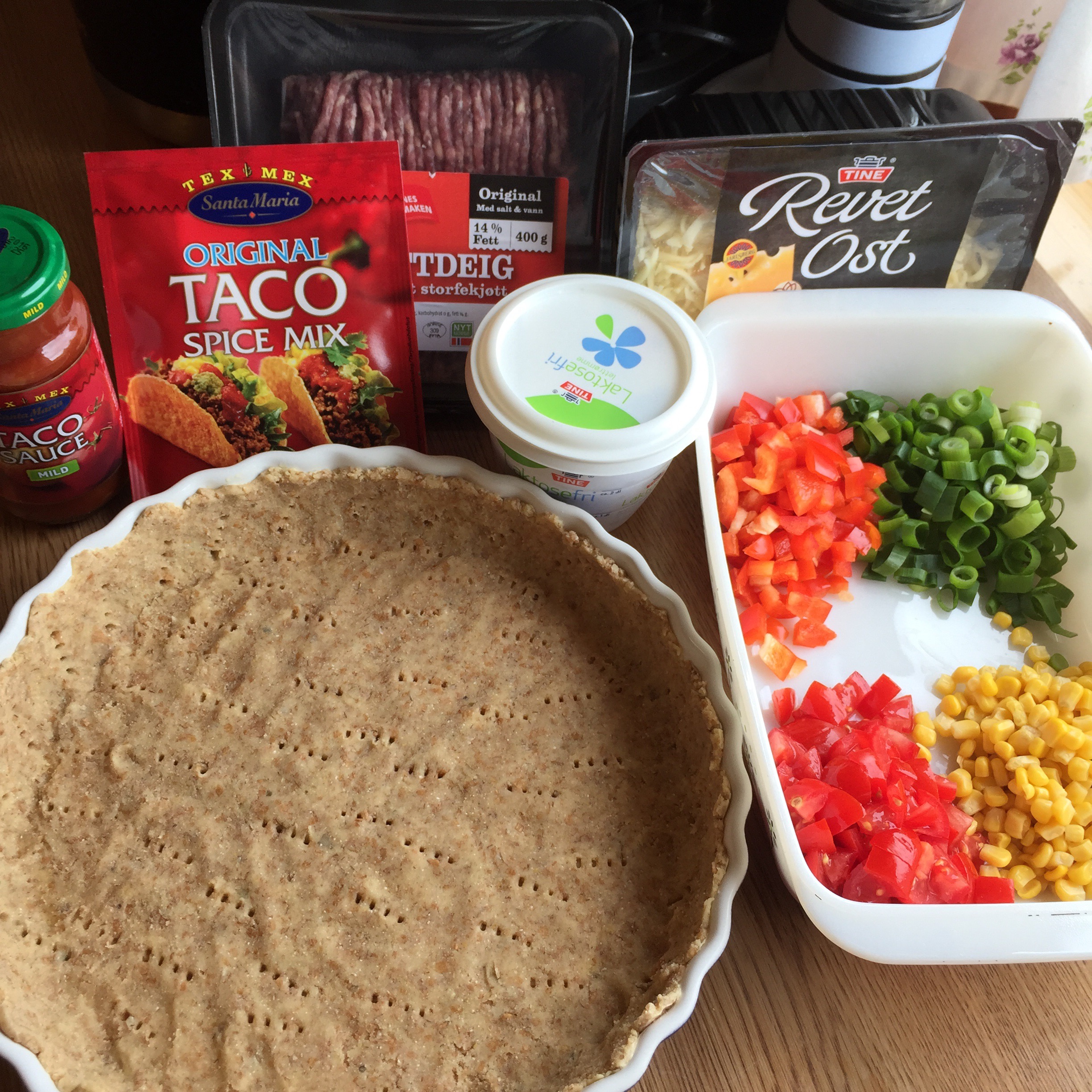 Inspirert av flinke elever som komponerte sin egen tacopai med grov paibunn valgte jeg å prøve meg på det samme. Uten oppskrift og med litt dårlig husk lagde jeg denne. Synes jeg klarte å lage noe som lignet ganske mye. God ble den og hele familien gikk god for både smaken og måten å servere taco på.