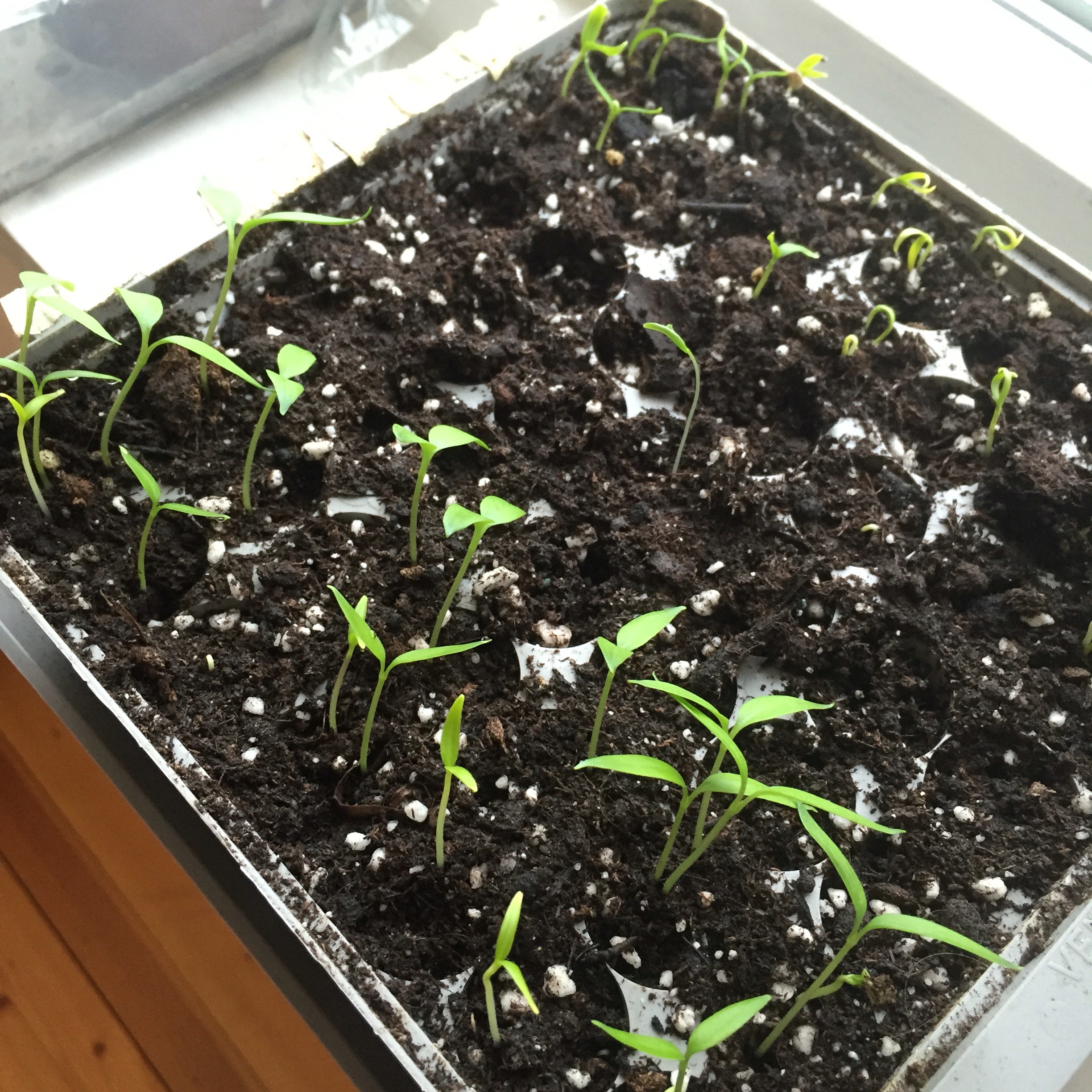 Vi har til nå plantet chili, paprika og koriander. Disse trenger tid på å vokse og har fått to uker på seg nå. Det blir som vanlig alt for mange planter når vi sår frø. Vi får gi bort noen planter etterhvert som de vokser ut av vinduskarmen.