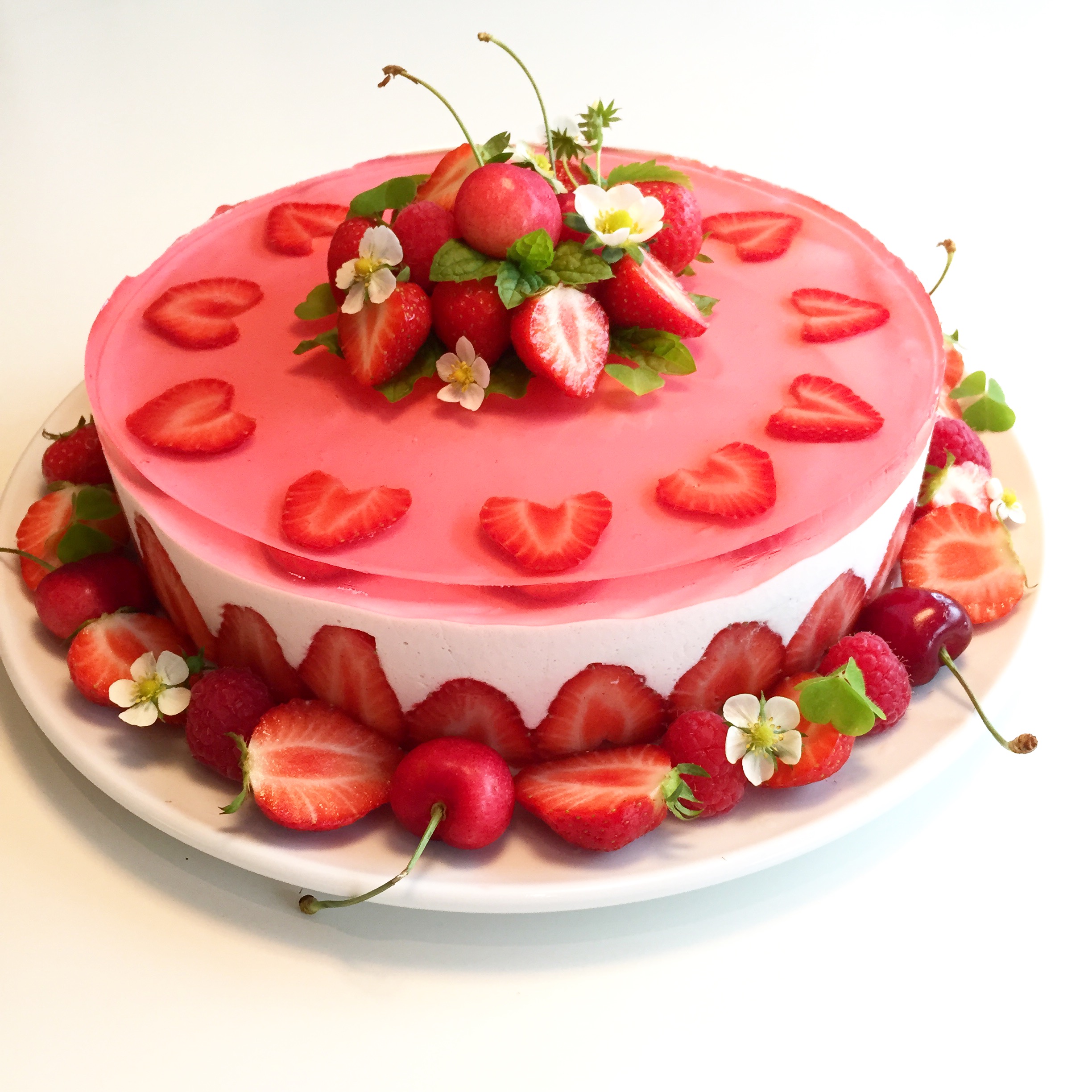 - Når fromasjen er stivnet kan du pynte med jordbær i skiver og helle gelé over bærene. NB! Tips for å få jordbærene til å ikke flyte rundt i geleen er å helle på bare litt gelé først. La dette stivne i kjøleskap, for så å ha på resten. (Dersom du har geleen på før fromasjen er skikkelig stivnet eller når den er litt for varm vil den renne igjennom fromasjen og legge seg som et lag lengre ned i kaka.)