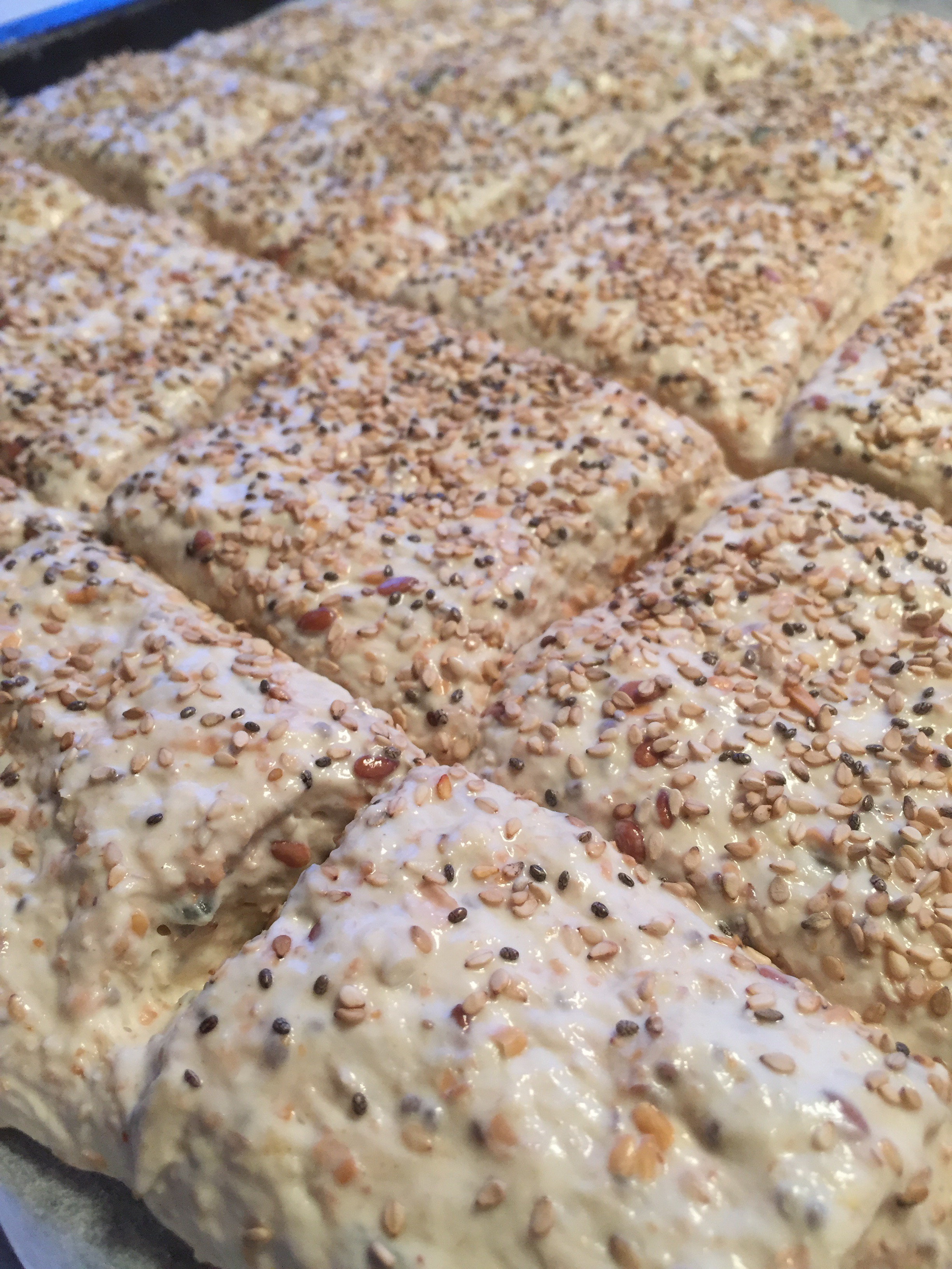 - Hell deigen over i en bakepapirkledd langpanne og klem den utover med vann på fingrene.