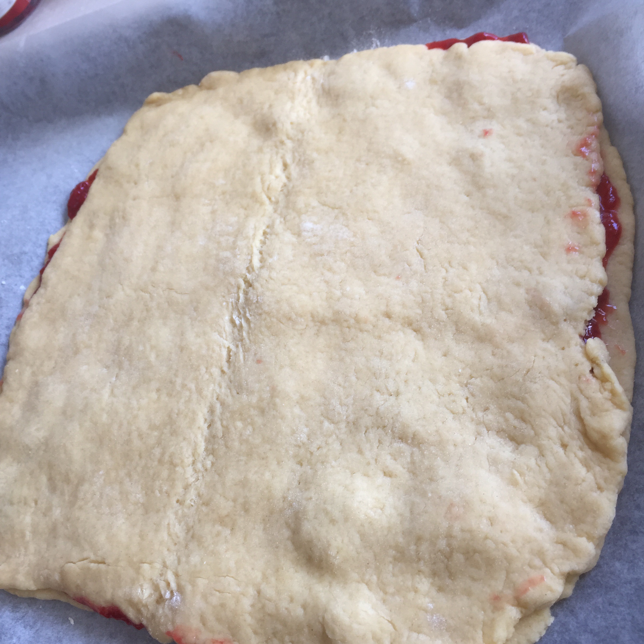 - Del deigen i to like store emner og kjevle disse ut til like store rektangler. Ca 1/2 cm tykke. Bruk litt hvetemel over og under så de blir lette å få opp fra benken. (Jeg brettet dem, flyttet dem og brettet dem ut igjen.)