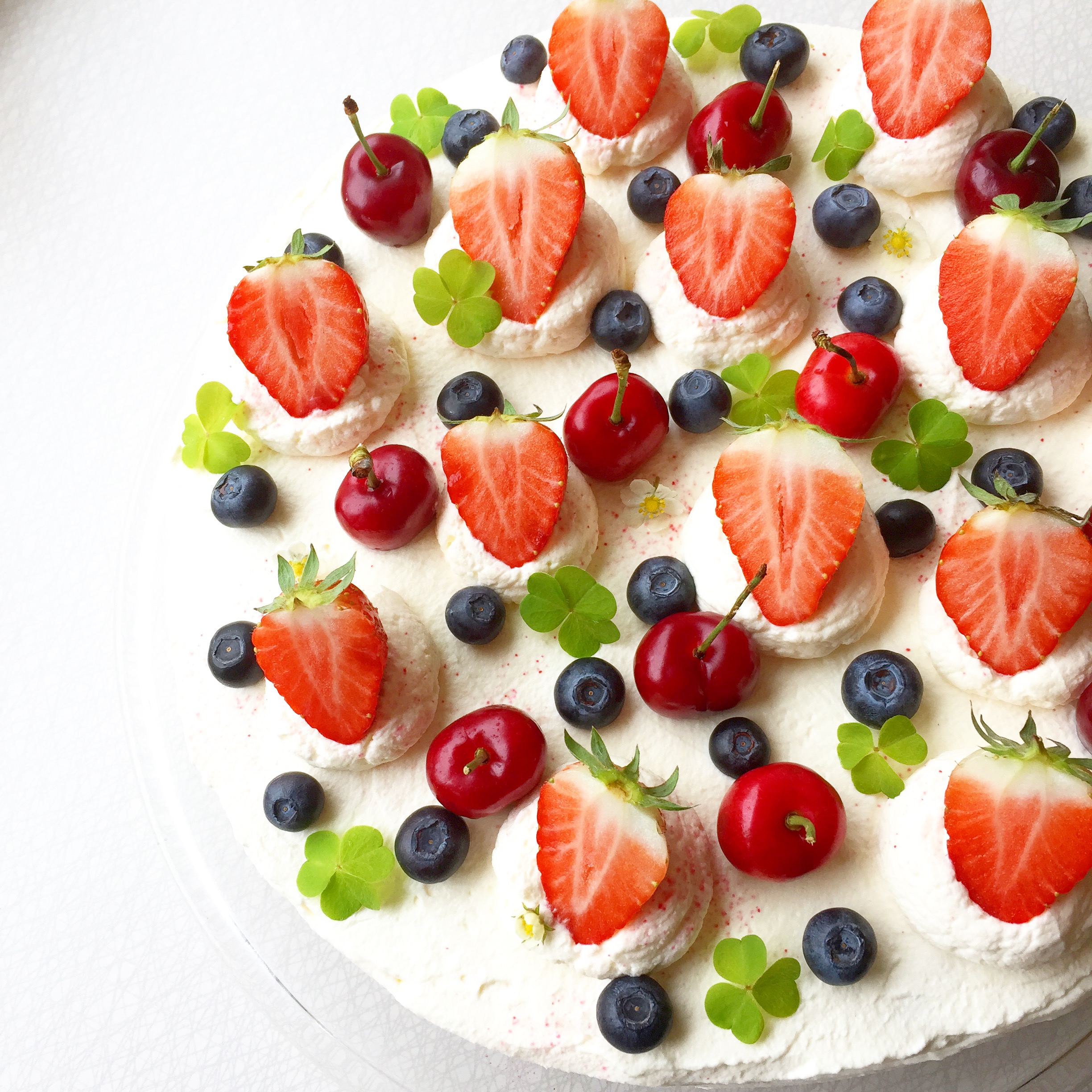 - Diverse bær, og spiselige blomster til pynt. Jeg har brukt moreller, jordbær, blåbær, markjordbærblomster og gaukesyreblad.