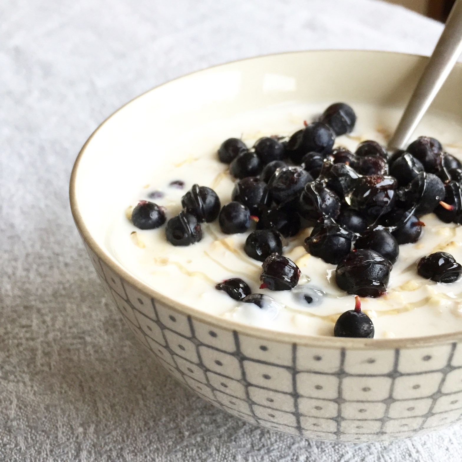 Inspirert av grøtentusiastene bak boka grøt på ville veier har kjøleskapsgrøt blitt en frokostfavoritt her hos oss. Denne er med honning og frosne blåbær.