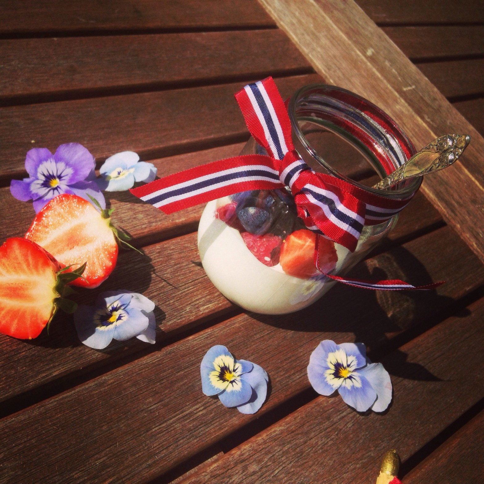 En enkel bløtkake med mye jordbær. Det enkle er ofte det beste. Ingredienser: 6 egg 2 dl sukker 175 g hvetemel 1,5 ts bakepulver 6-7 dl kremfløte 3 ss sukker Ca 20 jordbær 6-8 ss jordbærsyltetøy Diverse bær, og spiselige blomster til pynt. Jeg har brukt moreller, jordbær, blåbær, markjordbærblomster og gaukesyreblad. Framgangsmåte: Pisk eggFortsett å lese «Bløtkake med jordbær»