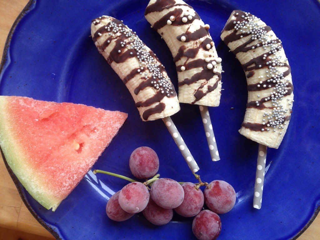 Bokstavlig talt frukt-is. Frossen frukt. Anbefales. Druene kan også brukes som isbiter. Vi har hatt litt sjokoladesaus som stivnet på isen på bananene og litt kakestrø. Vannmelonen smaker best om den ikke ligger alt for lenge i fryseren. En ide til neste barnebursdag? Vi spiser is med god samvittighet.